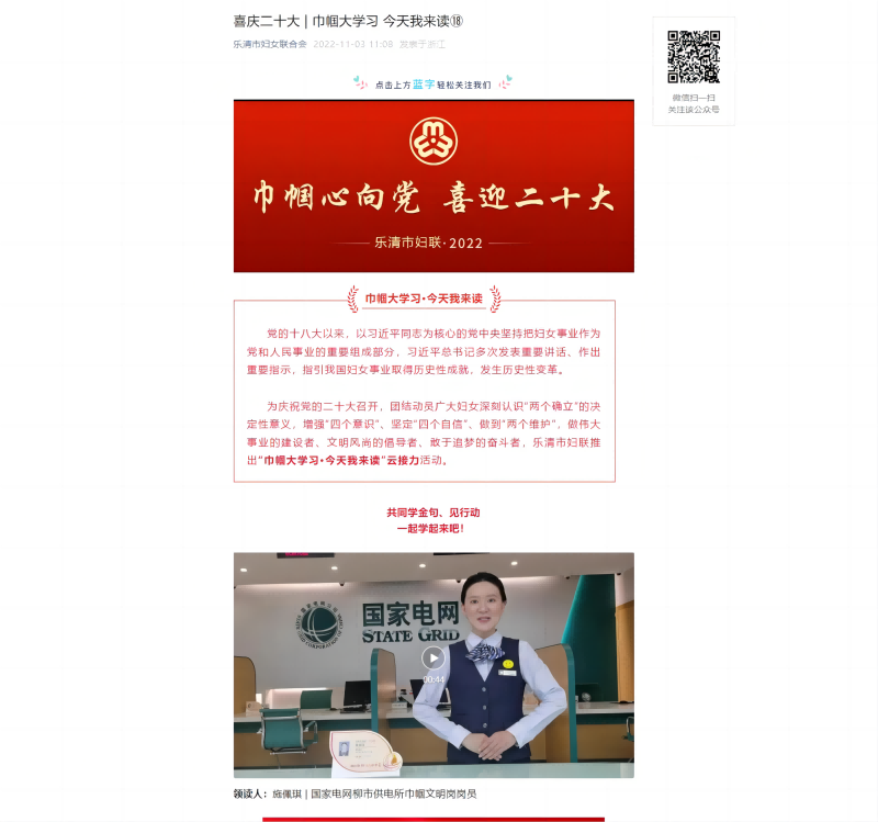 活动中,每一名心悦岗员工富有激情的朗读展示了员工自信、自强、乐观向上的正能量和女性独有的美丽,引领员工在岗位上再立新功。“我们要立足当下,坚定不移听党话、跟党走,让青春在建设具有中国特色国际领先的能源互联网企业中贡献力量。”在完成当天接力朗读活动后,柳市供电所巾帼文明岗的岗员说道。